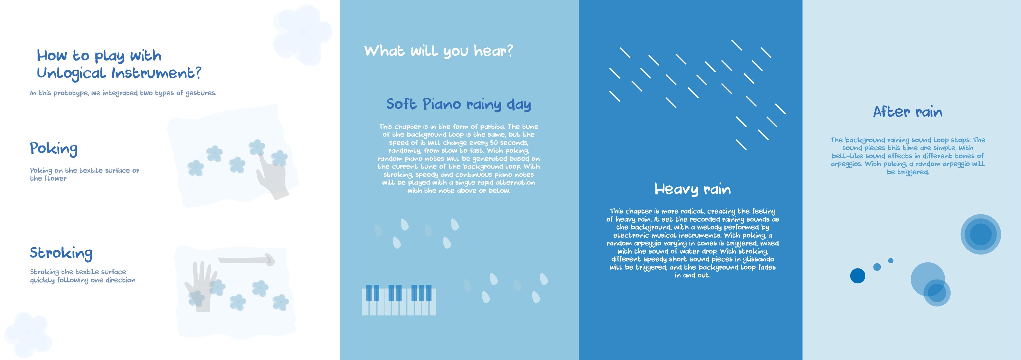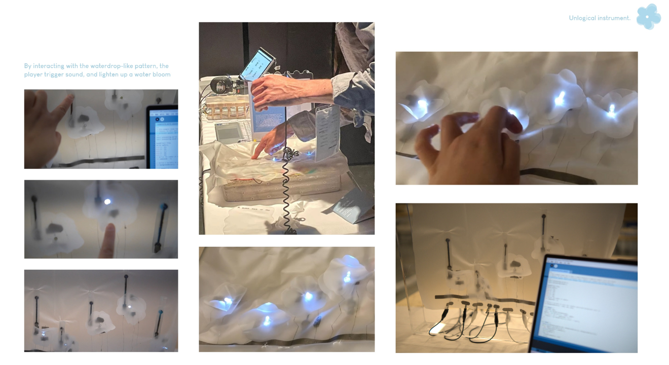 Unlogical Instrument - 01 locates the focus on the textile. It's an artwork investigates the relationship between the gestures and the sound perception that originates from the textile through a material-driven approach. Inkjet printing is applied to transfer the original textile into a sensorial interface. The audience will listen to the sound while interacting with the textile surface, exploring and understanding this instrument through free-form playing.