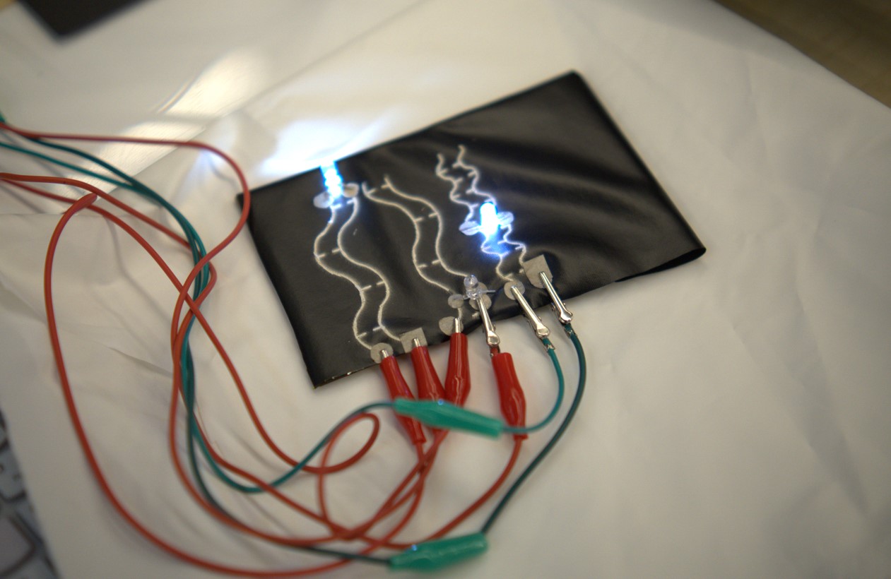 Ongoing, using artificial leather with printed circuit, rub (contact) to make sound.