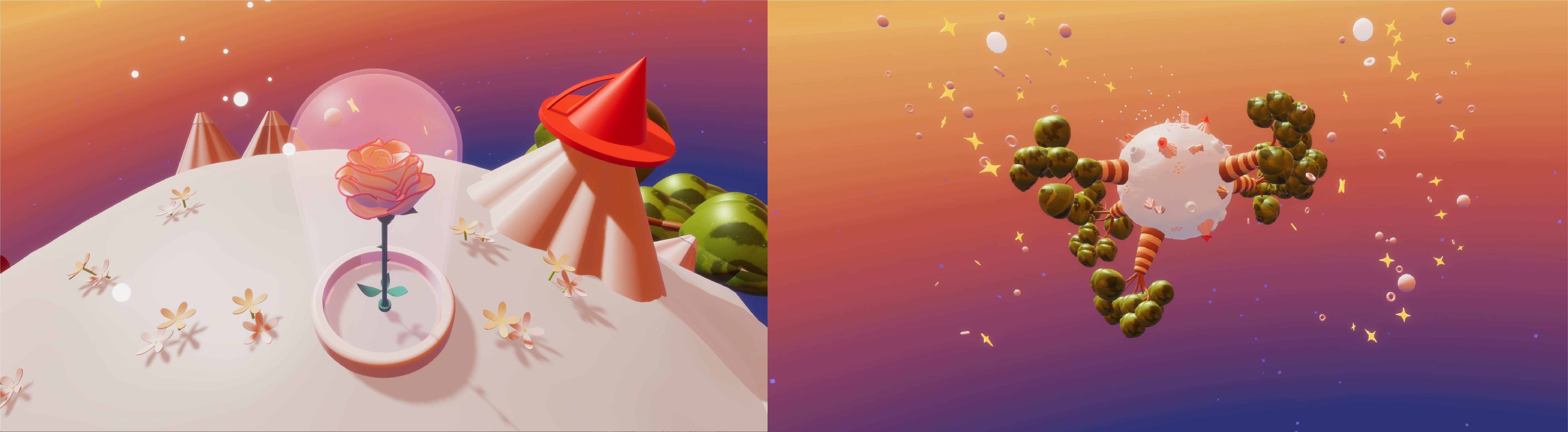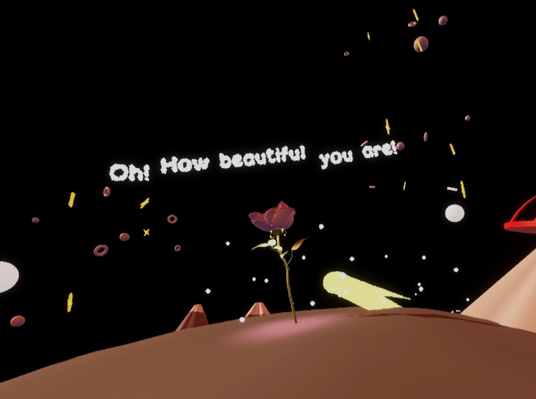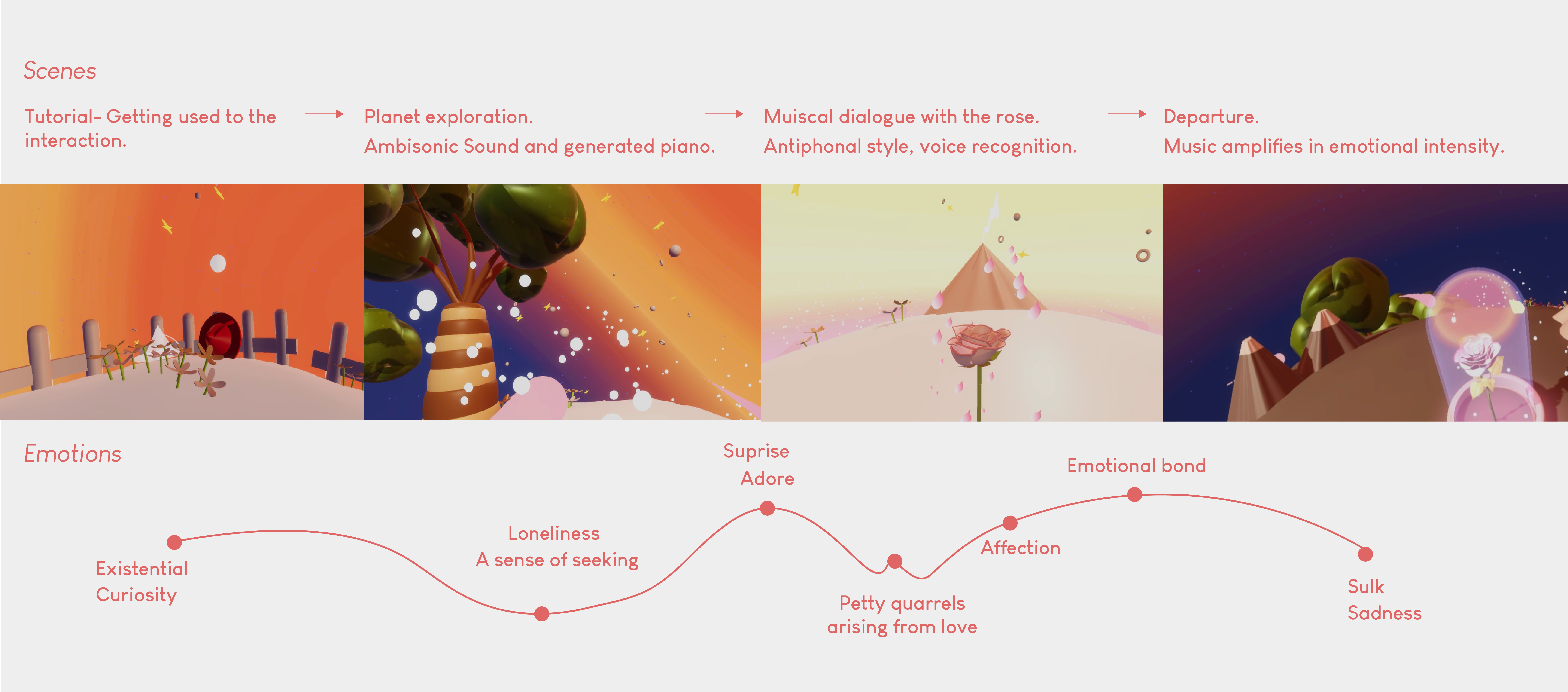In Tame, music conveys emotional states and narrative tone, using ambisonics for sound sources like baobabs and volcanoes. The interactive music consists of two parts: 1. Walking on the Planet: A generative soundtrack inspired reflecting the little prince's loneliness, triggered by player's virtual walking. 2. Musical Dialogue with the Rose: A Cantata-style dialogue invites audience participation, with AI-composed songs for the rose.